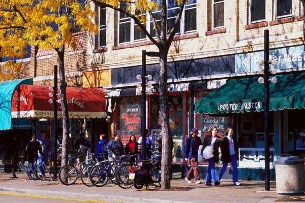 "...a funky half-mile strip of food, music, craft and clothing shops running from the university campus to the imposing state capitol building."